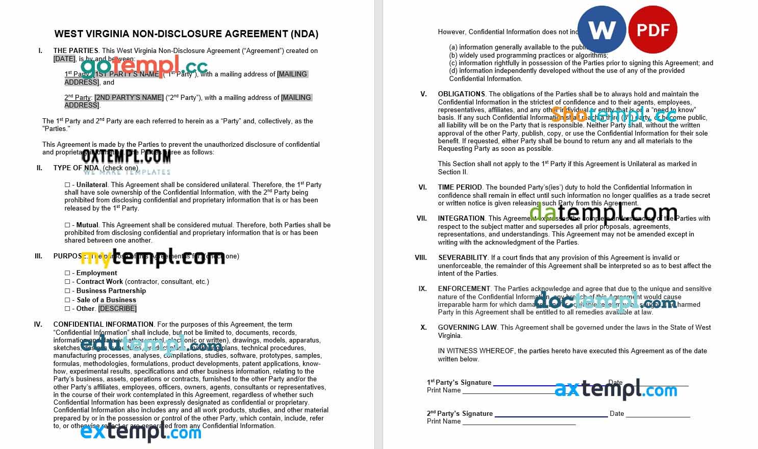 Freefree download West Virginia non-disclosure agreement NDA example, Word and PDF format