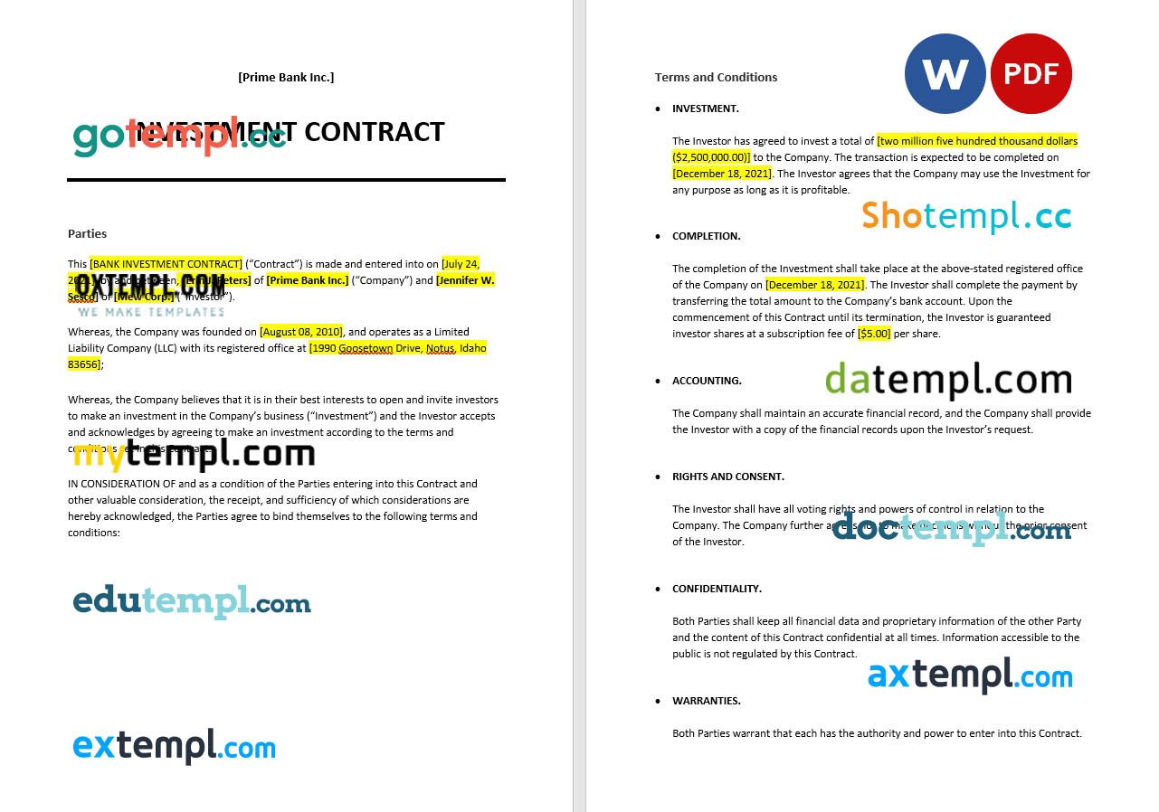 Freefree download capital investment contract example, Word and PDF format